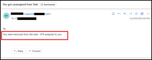 The previous assignee receives an email stating: "You were removed from the task."
