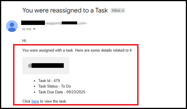 When a user updates the task, the tagged user will receive an email notification. This email includes details such as Task ID, updated Task Status, and Task Due Date, along with a link to view the task.