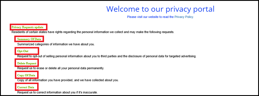 • Summary of Data, OptOut, Delete Request, Copy of Data, and Correct Data.