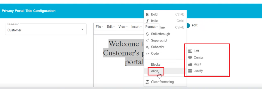 Note: The configurations made under Welcome Page Configuration apply to the entire text displayed on the Privacy Portal welcome screen by default. These settings can be overridden at the individual level if specific styles are defined under Header, Title, or Subtitle sections.