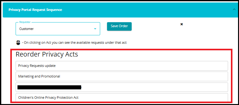 • This feature allows you to control the order in which different Privacy Acts and their corresponding Privacy Requests appear for each Requestor Type (Employee, Customer, Vendor, etc.).