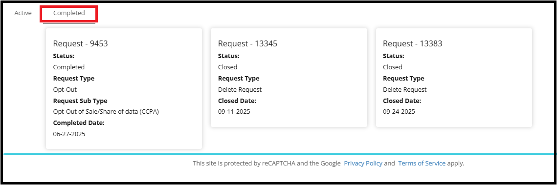 • Completed tab in the Privacy Portal contains details of requests that have been fully processed.
