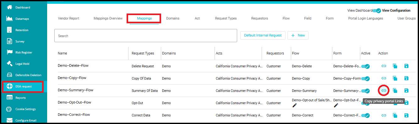 4. In the Action column of that row, click the icon of Copy privacy portal Link.