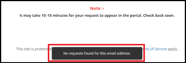 1. When you enter an incorrect email address and click Generate Code, a message appears at the bottom saying: "No requests found for this email address."