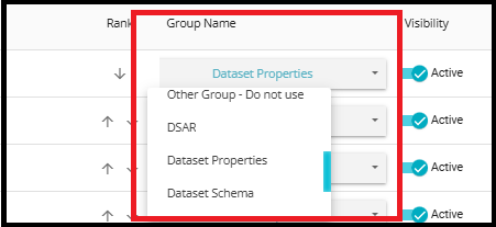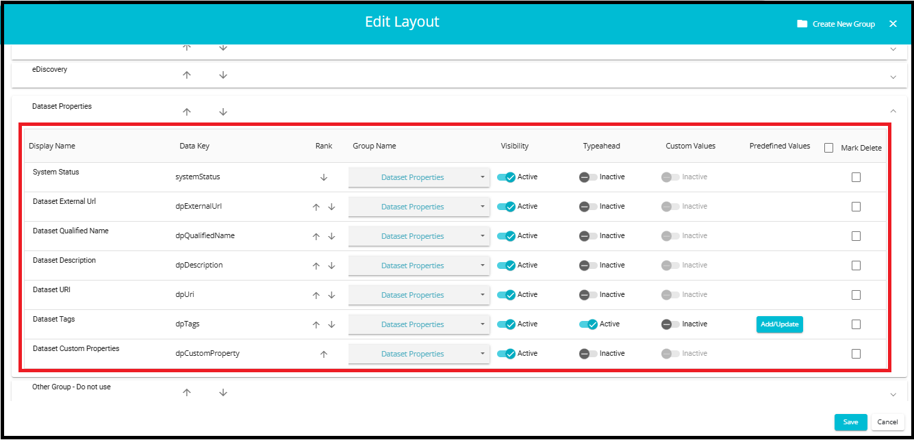 When a group—such as System Details or Dataset Properties—is expanded, it reveals a detailed table of metadata columns associated with that group. Each column can be configured individually, with options to set its display-name, visibility, searchability, and whether it supports custom or predefined values. Users can also adjust the column order using rank controls, assign it to a different group, or mark it for deletion. This granular level of control ensures that metadata remains relevant, searchable, and aligned with internal policies and compliance requirements.