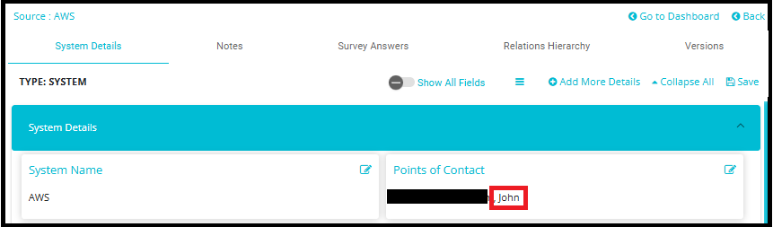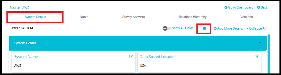 To view all fields of the selected system (e.g., AWS), click the dropdown arrow at the right-hand corner of each category or simply click anywhere on the category itself after the arrows.