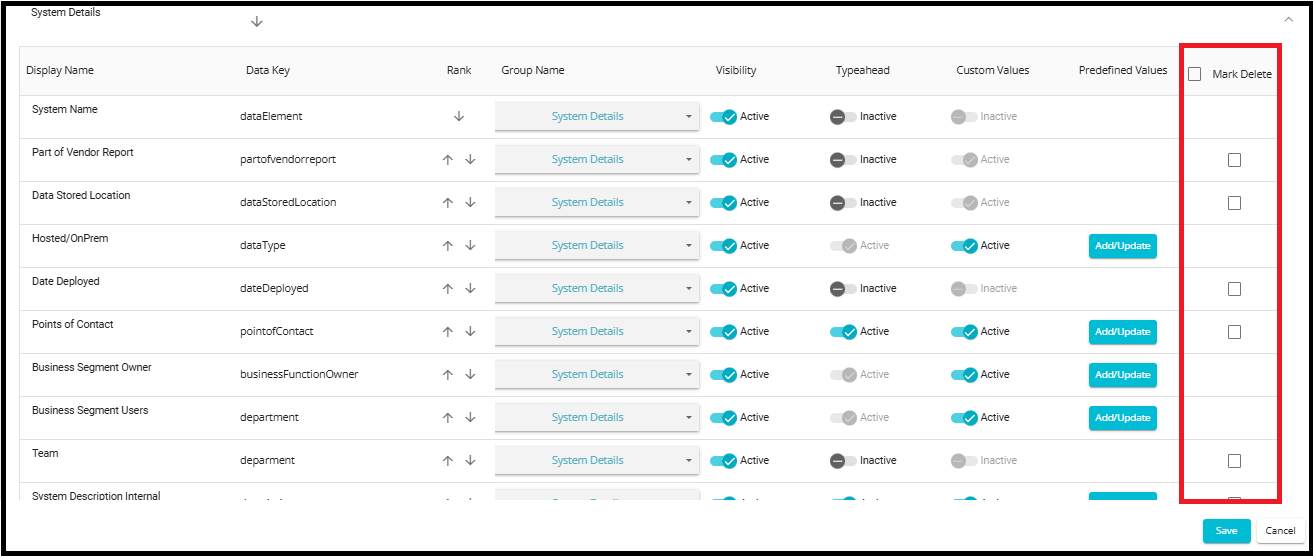 To delete all metadata columns for the selected system, click the checkbox next to "Mark Delete" at the top of the column.