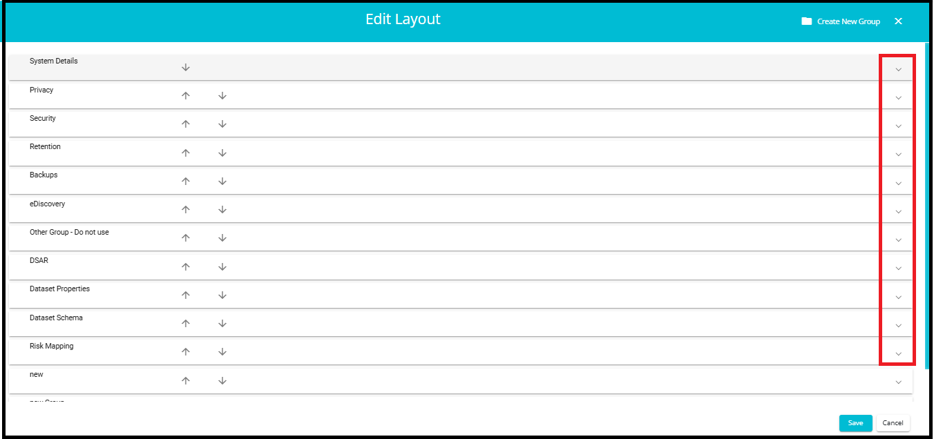 In DataMap systems, the Edit Layout interface provides a structured and highly customizable environment for managing dataset metadata. It organizes metadata into logical groups such as System Details, Privacy, Security, Retention, and more. Each group is displayed in a collapsible format, allowing users to expand or collapse sections using dropdown arrows. This makes it easy to navigate and prioritize Metadata categories based on organizational needs. Users can also create new groups or reorder existing ones to reflect evolving data governance structures.